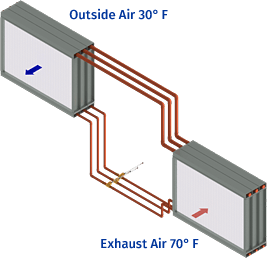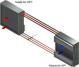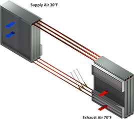 Coilmaster’s HRM-V Split Passive Heat Pipes system uses multiple charged circuits, with two rows of heat exchangers, a vapor header at the top, and a liquid header at the bottom. A permanent elevational difference between supply and exhaust air streams enables optimized recovery for the season that yields the most BTUs, while still allowing partial recovery in the off-season.
